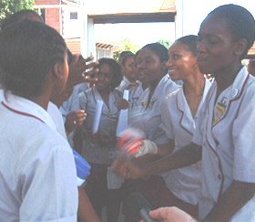 | At 10, girls piled in and sat one or two to a computer. Wayne managed to hold their attention for a few minutes to repeat some basics. And they got started. I was glad I had watched Wayne so much and messed around on Fruityloops myself because there were too many questions for Wayne to handle by himself. Girls went at different paces and made every kind of music from dancehall to techno. As they would run into trouble, Wayne would go to them and give them a few pointers to keep them moving in a good direction. At 11 they were all still going strong. Howard came and told us that it was their lunch period, but if we didn't mind, they could stay. We didn't mind. Most of them stayed through most of their lunch period and came away with some pretty good little songs: Catherine, Shanika, Sydoney & Zelika. | ![]() |