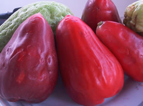 On our first day here, driving with Trevor, we passed a stand on the side of the road selling fruits. One of the fruits looked like a bright red pear. Trevor told us that they were otaheite apples, but I didn't catch the name and Wayne thought he had said "Ethiopie" apples (hence our earlier incorrect references to them as Ethiopian apples.) Trevor said they weren't much like the apples we knew. They had a milder flavor and were softer. He went on to describe how when he came to Kingston with his mother as a boy he would plead and plead for her to buy an apple and finally she would buy one and cut it up into slices, giving one to each child.