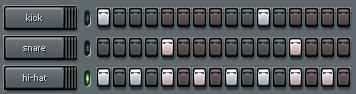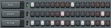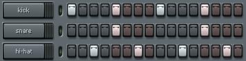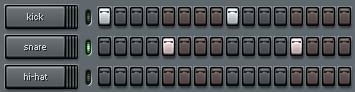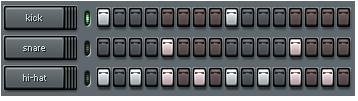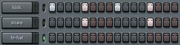 Loaded into the channels are a kick drum, a snare drum, and a hi-hat cymbal: the three basic percussive elements in most genres of popular music, from hip-hop and rap to house and techno, r&b and funk, rock and pop, dancehall and roots reggae, drum and bass, jungle, trance, electro, etc.
