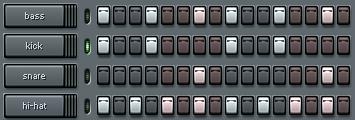 The grid can contain as many boxes as one desires (go to <options>, then <song settings>). Grids of 16, 32, and 64 boxes--i.e, large multiples of 4--are the most common and the ones I would recommend trying at first. Each sound (a .wav file) is stored in a separate channel, of which one has an unlimited number (it starts you with 4). Fruityloops comes with a large and varied soundbank, consisting mostly of synthesized sounds. With a .wav editor (such as Cooledit or Soundforge) and a little imagination, however, the sky is the limit.