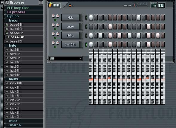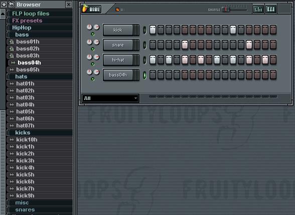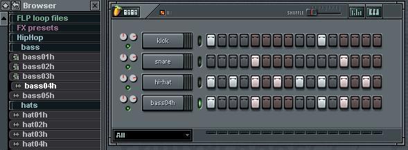The easiest way to add new sounds is to drag them into the step-sequencer window from the browser (see below, on the left-hand side). One can drop a new sound on an existing channel if one wants to replace the sound it already contains, or one can drop a new sound in the space below (or in between) the existing channels, where fruityloops will create a new channel to hold it. In the illustration below, I have created a new channel to hold the sound, "bass04h," by dragging it over and dropping it in the empty space below the hi-hat channel.